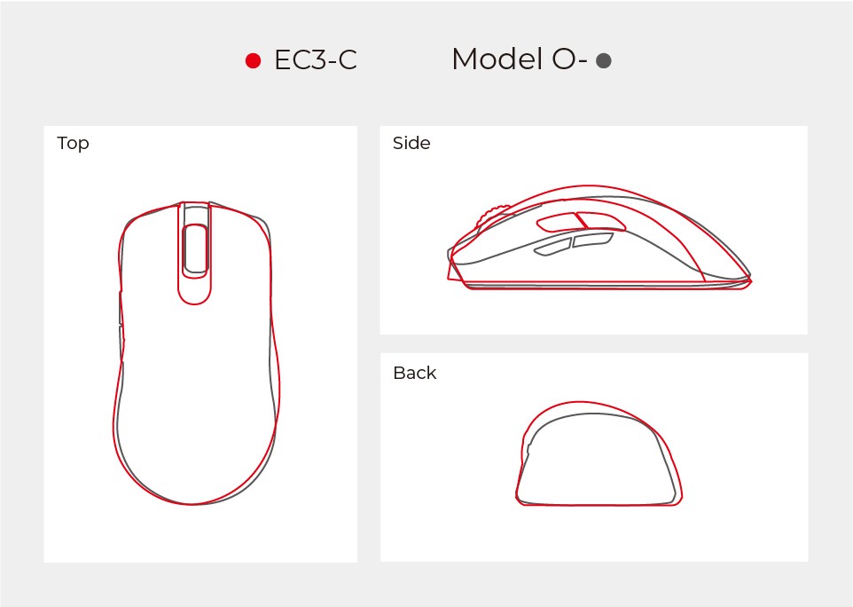 La prise en main est différente selon les préférences de chacun, comme la taille de la main, le style de prise en main et la façon dont vous jouez dans le jeu. Il est préférable d'évaluer la différence de prise en main de la EC3 par rapport à votre souris actuelle. Voici une comparaison entre l'EC3 et l'EC2 ainsi qu'avec des modèles d'autres marques pour que vous puissiez imiter votre sensation de prise en main et décider si l'EC3 est la bonne forme/taille pour vous.