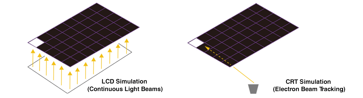 To tutaj DyAc™/DyAc⁺™ wchodzi do gry, symulując kineskopowy CRT (Cathode Ray Tube). CRT tworzy obrazy za pomocą śledzenia wiązki elektronów, więc poruszający się obiekt nie ma powidoku.