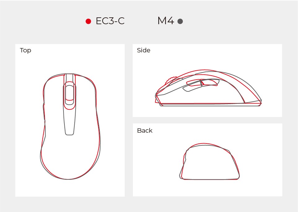 การจับจะแตกต่างกันไปขึ้นอยู่กับความชอบของแต่ละคน ไม่ว่าจะเป็นขนาดมือ สไตล์การจับ และวิธีการเล่นเกมของคุณ การเปรียบเทียบความรู้สึกในการจับบน EC3 กับเมาส์ที่คุณใช้อยู่ในปัจจุบันจะเป็นทางเลือกที่ดีกว่า นี่คือการเปรียบเทียบคร่าวๆ ระหว่าง EC3 กับ EC2 และ EC3 กับรุ่นอื่นๆ จากแบรนด์อื่นๆ เพื่อให้คุณได้ลองสัมผัสและเปรียบเทียบ EC3 กับรูปทรง/ขนาดที่ใช่สำหรับคุณ