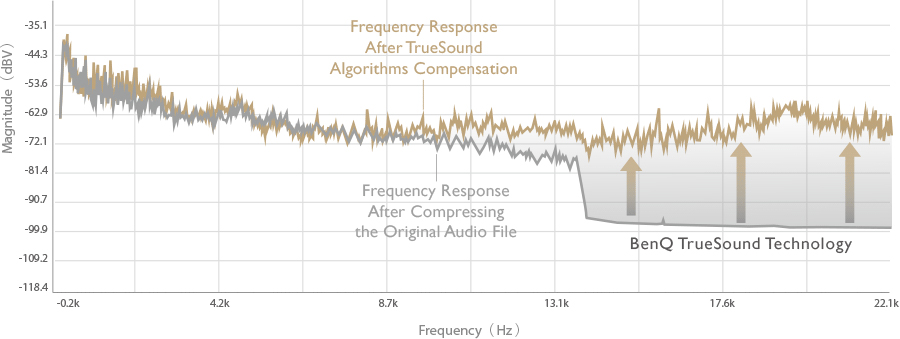 Der Lautsprecher nach treVolo 2 verfügt über eine einzigartige Technik namens TrueSound, die die Klangqualität von hochgradig komprimierten Audiodateien verbessern kann. Erkennt der DSP-Chip im Lautsprecher den Mangel an höherfrequenten Daten aufgrund einer Aufnahme mit niedriger Bitrate oder hohem Komprimierungsgrad, verbessert TrueSound die Detailgenauigkeit in den höheren Bereichen des Audiospektrums.