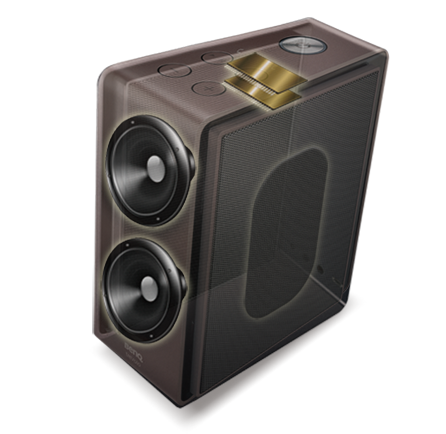 Das Konstruktionsteam hat sich intensiv mit der Strukturakustik beschäftigt. Durch Untersuchungen zur "Luftmechanik" und zur "Stoßdämpfung" von Materialien konnten die Ingenieure mit dem elektrostatischen Mittel-/Hochtöner Verbesserungen bei Klangdiffusionseffizienz, Bassausdruck und Balance erzielen. Das Resultat daraus ist eine unnachahmliche Rundum-Akustik für mobile Audioerlebnisse.