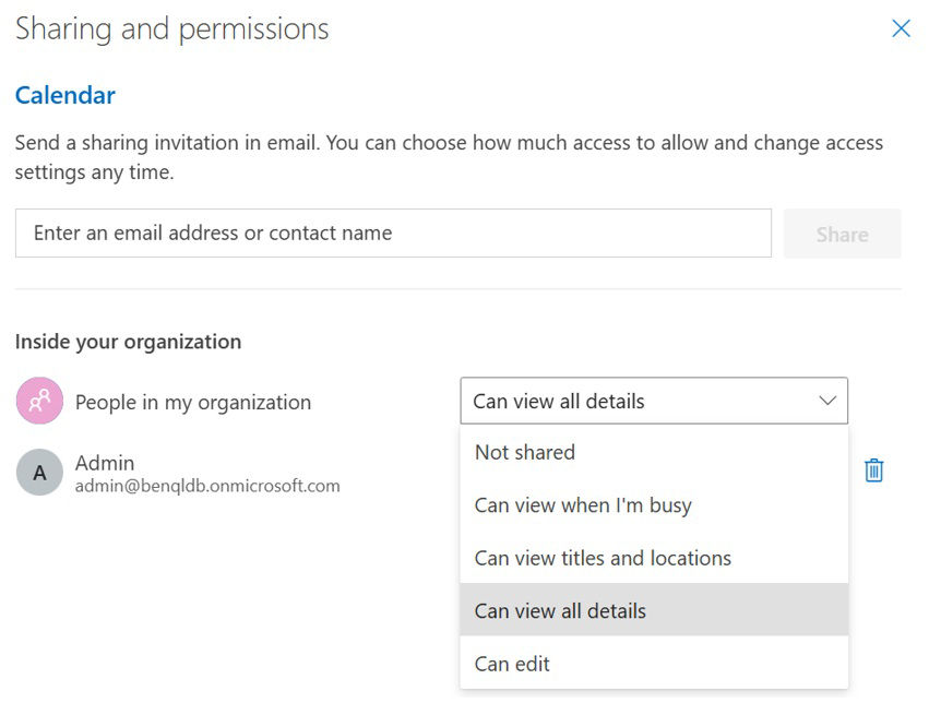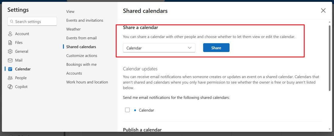 3. Under Share a calendar, select a calendar and Click Share.