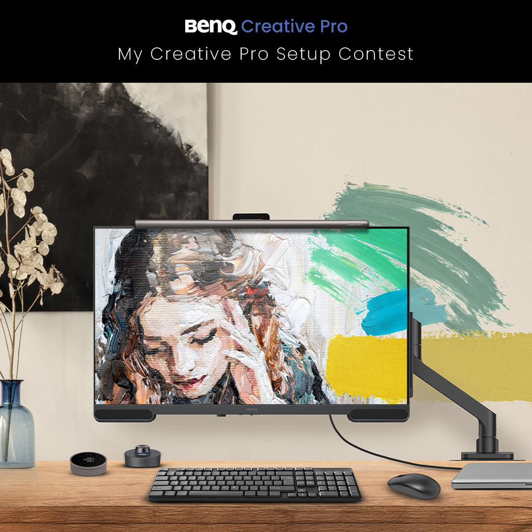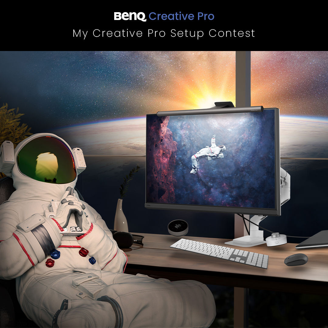 I. Create an image or short animation with your setup including at least 1 Creative Pro monitor (PD2730S, o PD3226G, PD2725U or PV3200U), 1 BenQ Ergo Arm (black or white) and 1 ScreenBar Halo 2.