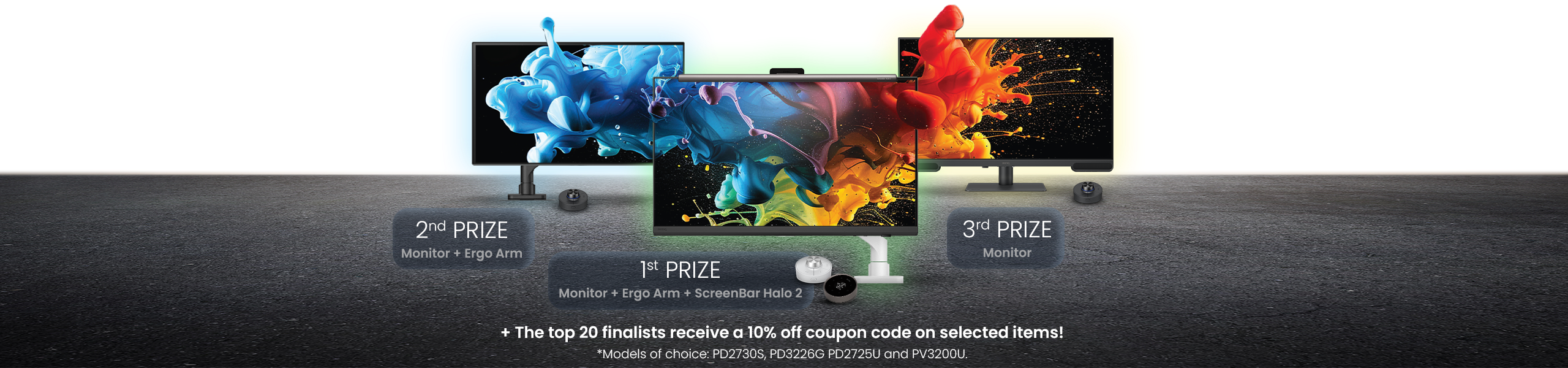 9. The competition will have one first-prize winner, one second-prize winner, one third-prize winner. The first-prize winner will receive one monitor, one premium ScreenBar Halo 2 and one ergo arm. The prizes include delivery costs. The second-prize winner will receive one monitor and one ergo arm. The prizes include delivery costs. The third-prize winner will receive a BenQ monitor. The prize also includes delivery costs. The top 20 finalist will receive individual 10% discount codes for the following products: PVS7, PD2706QN, PD2706U, PD2725U, PD2706UA, PD2730S, PD2770U, PD3205U, PD3205UA, PD3225U, PD3226G, PV3200U, BSH01, BSH02, BDH01, ScreenBar Halo 2. Valid for 1 month. The Organiser reserves the right to grant additional “Special Mention” prizes to any candidate at its sole discretion.