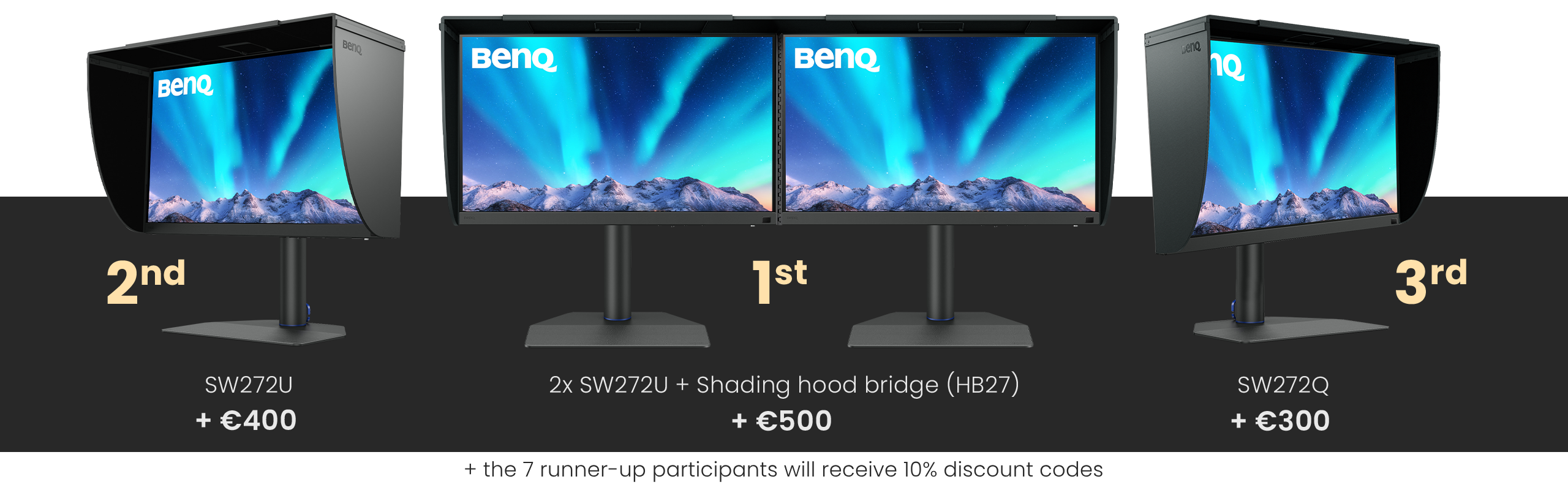 9. The competition will have one first-prize winner, one second-prize winner, one third-prize winner and 7 runner-ups. The first-prize winner will receive 2x BenQ SW272U PhotoVue monitors, an HB27 Shading Hood Bridge, €500 prize money and a complementary one-year subscription to Pantone Connect Premium. The prizes include delivery costs. The second-prize winner will receive a BenQ SW272U PhotoVue monitor, €400 prize money and a complementary one-year subscription to Pantone Connect Premium. The prizes include delivery costs. The third-prize winner will receive a BenQ SW272Q PhotoVue monitor, €300 prize money and a complementary one-year subscription to Pantone Connect Premium. The prize also includes delivery costs. The 7 runner-ups will receive individual 10% discount codes for the SW and PD monitor lines. Valid for 1 month. The winners will receive their monetary prize in their local currency at the current exchange rate at the time the prize is awarded. The Organiser reserves the right to grant additional “Special Mention” prizes to any candidate at its sole discretion.