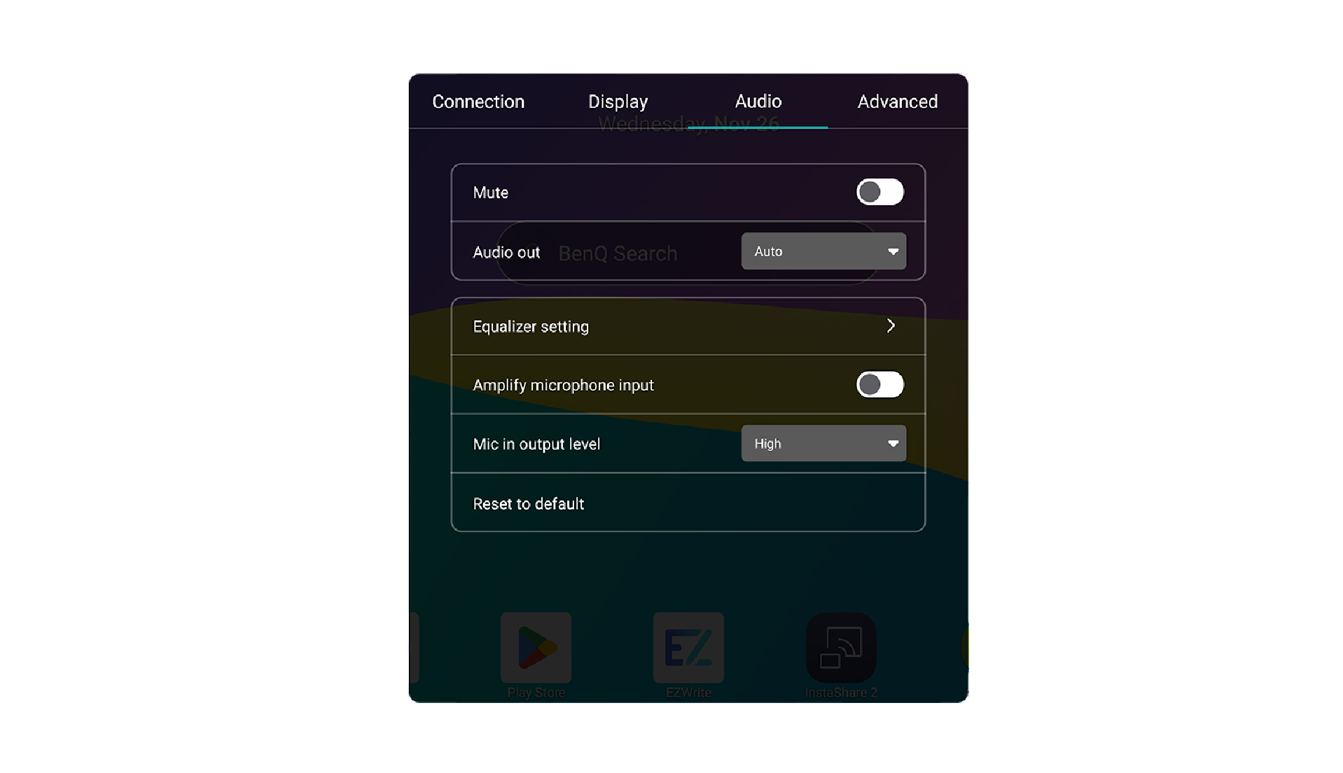 Microphone sharing allows the slot-in PC or devices that are connected either through USB-C or Touch USB to use the BenQ Board microphone as an audio input source. Enable or disable this setting in Settings > Advanced > Accessories.