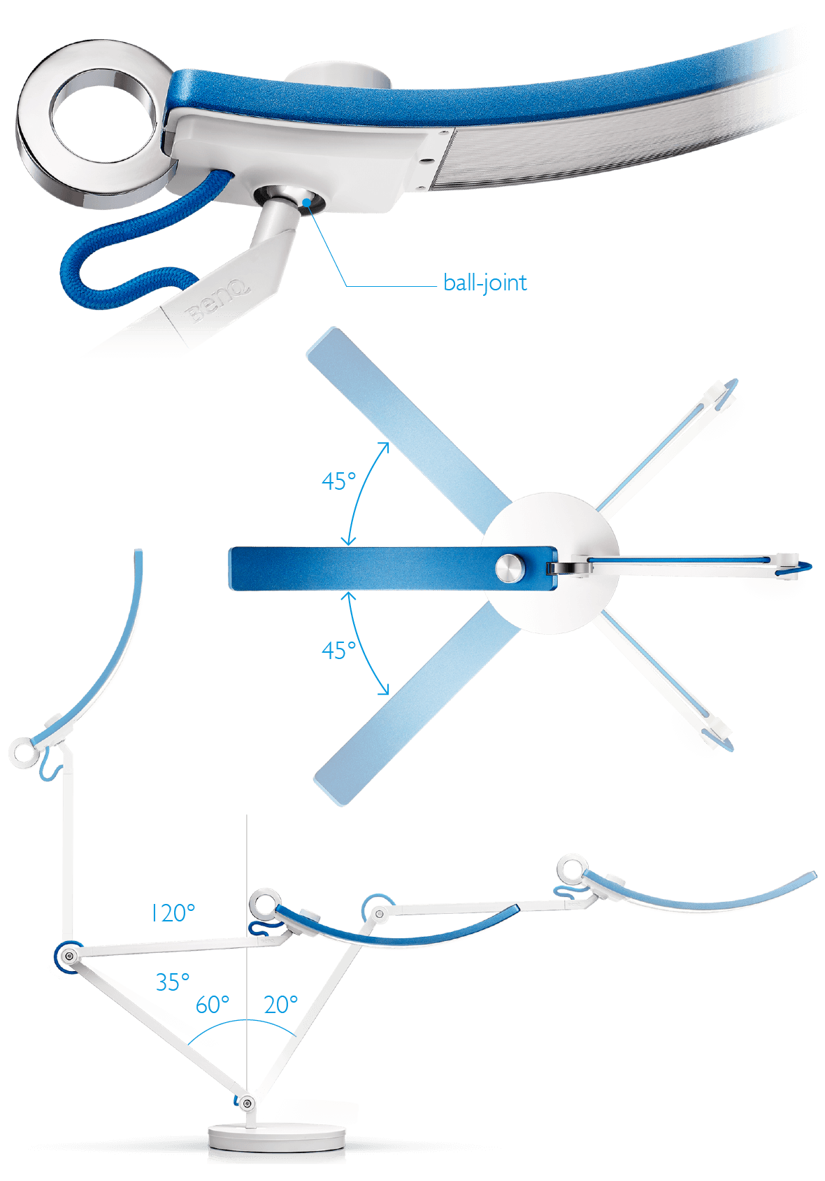 WiT has a ball-joint to optimize the flexibility of the lamp cap and the highly durable torque springs and precise friction control can counter-balance the weight. So you can easily adjust the LED light to the angles that you need.