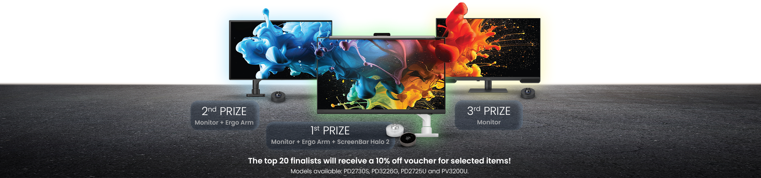9. The competition will have one first-prize winner, one second-prize winner, one third-prize winner. The first-prize winner will receive one monitor, one premium ScreenBar Halo 2 and one ergo arm. The prizes include delivery costs. The second-prize winner will receive one monitor and one ergo arm. The prizes include delivery costs. The third-prize winner will receive a BenQ monitor. The prize also includes delivery costs. The top 20 finalist will receive individual 10% discount codes for the following products: PVS7, PD2706QN, PD2706U, PD2725U, PD2706UA, PD2730S, PD2770U, PD3205U, PD3205UA, PD3225U, PD3226G, PV3200U, BSH01, BSH02, BDH01, ScreenBar Halo 2. Valid for 1 month. The Organiser reserves the right to grant additional “Special Mention” prizes to any candidate at its sole discretion.