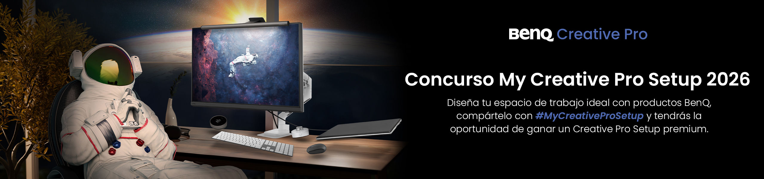 I. Crear una imagen o una animación corta de su setup que incluya al menos 1 monitor Creative Pro (PD2730S, o PD3226G, PD2725U o PV3200U), 1 BenQ Ergo Arm (negro o blanco) y 1 ScreenBar Halo 2.
