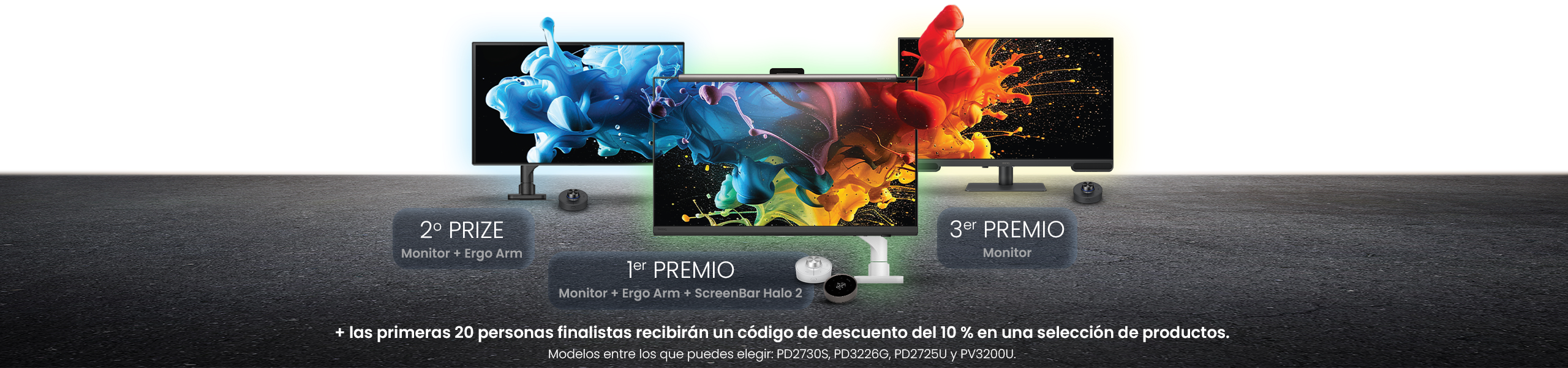9. Habrá una persona ganadora para el primer premio, una para el segundo premio y una para el tercer premio. La ganadora del primer premio recibirá un monitor, una ScreenBar Halo 2 premium y un ergo arm. Los premios incluyen los gastos de envío. La persona que quede en segundo lugar ganará un monitor y un ergo arm. Los premios incluyen los gastos de envío. La persona que quede en tercer lugar recibirá un monitor BenQ. Ganadores porán elegir entre los monitores PD2730S, or PD3226G, PD2725U or PV3200U. El premio también incluye los gastos de envío. Las 20 finalistas recibirán códigos individuales de descuento del 10% para los siguientes productos: PVS7, PD2706QN, PD2706U, PD2725U, PD2706UA, PD2730S, PD2770U, PD3205U, PD3205UA, PD3225U, PD3226G, PV3200U, BSH01, BSH02, BDH01, ScreenBar Halo 2. Válido durante 1 mes. La organización se reserva el derecho de otorgar premios de “Mención Especial” adicionales a cualquier participante a su sola discreción.