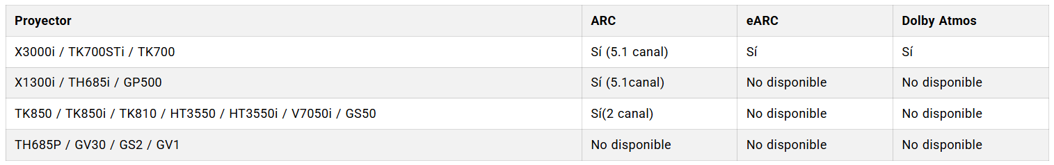 En lo que se refiere a los proyectores, BenQ ofrece una amplia gama de modelos compatibles con ARC y eARC. La siguiente tabla incluye una lista de proyectores y su compatibilidad de audio: