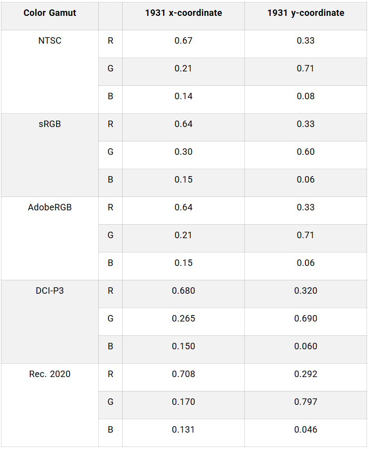 Por supuesto, hay muchas más gamas de colores que NTSC y sRGB. Por ejemplo, AdobeRGB, DCI-P3, EBU, AppleRGB, etc. Todas tienen sus propias coordenadas de color R, G y B y puntos blancos y especificaciones de brillo asociados, y por supuesto, su propia aplicación. Por ejemplo, AdobeRGB está diseñado para su uso en la industria de las artes gráficas, principalmente con fines de impresión, DCI-P3 se utiliza principalmente en el cine digital y EBU se utiliza en la industria de la radiodifusión europea. Rec. 2020 es un estándar recientemente desarrollado para todos los dispositivos en el futuro, y representa casi todos los colores que los humanos pueden percibir.