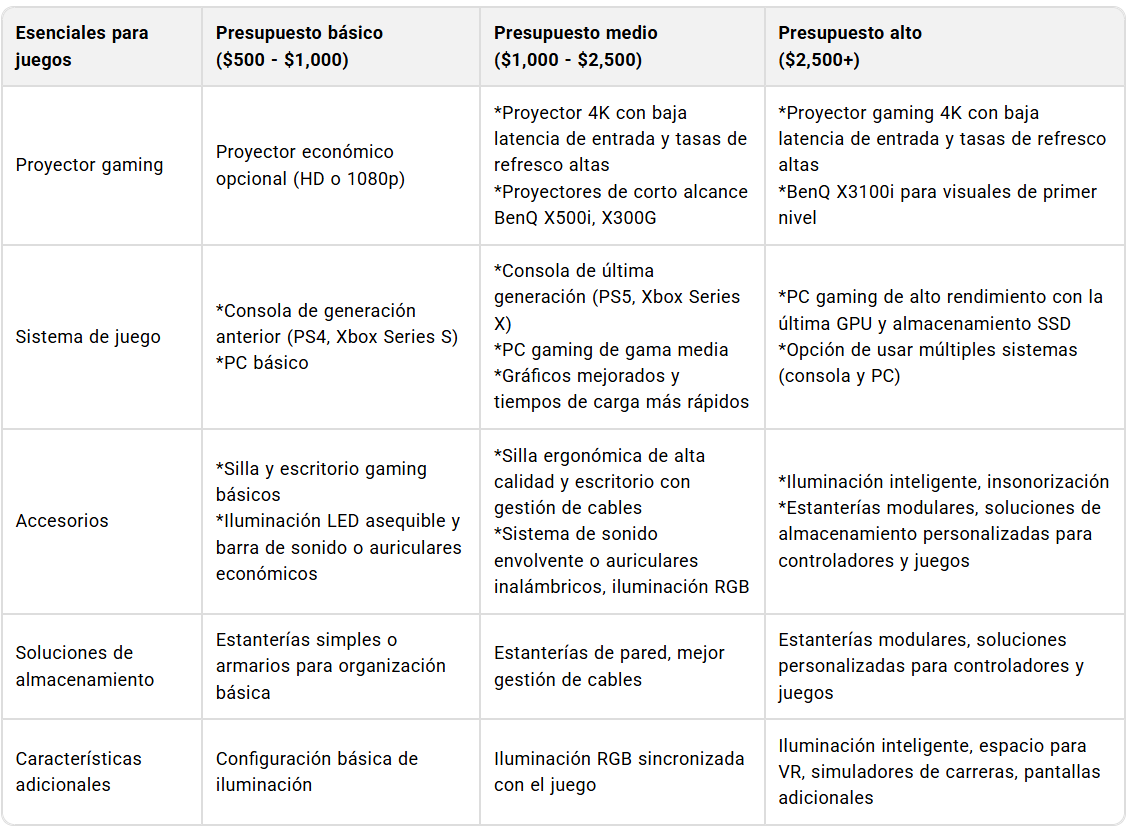 Al planificar la configuración de tu sala de juegos, establecer un presupuesto es clave para garantizar que obtengas el mejor valor por tu inversión. Tanto si cuentas con un presupuesto amplio como reducido, es posible crear un espacio de juego efectivo y agradable. Aquí tienes una comparación de lo que puedes esperar en diferentes niveles de presupuesto: