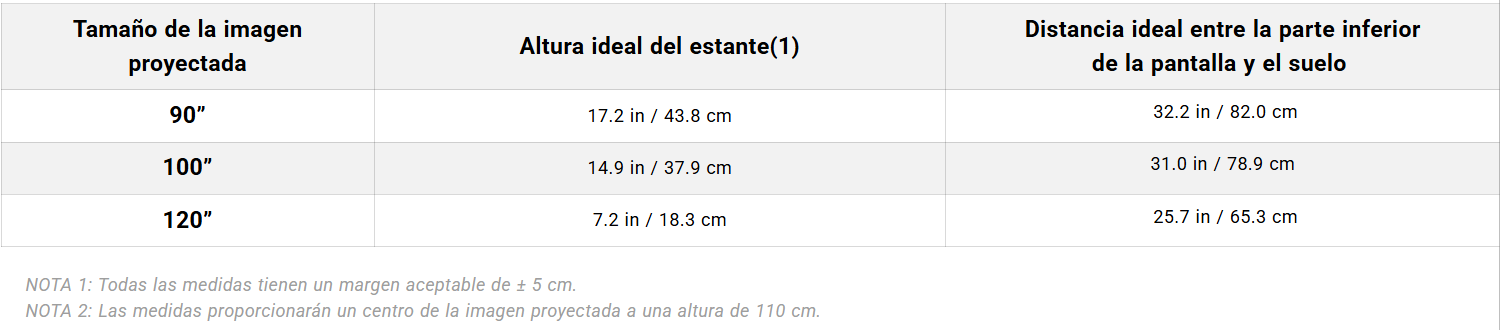 NOTA 2: Las medidas proporcionarán un centro de la imagen proyectada a una altura de 110 cm.