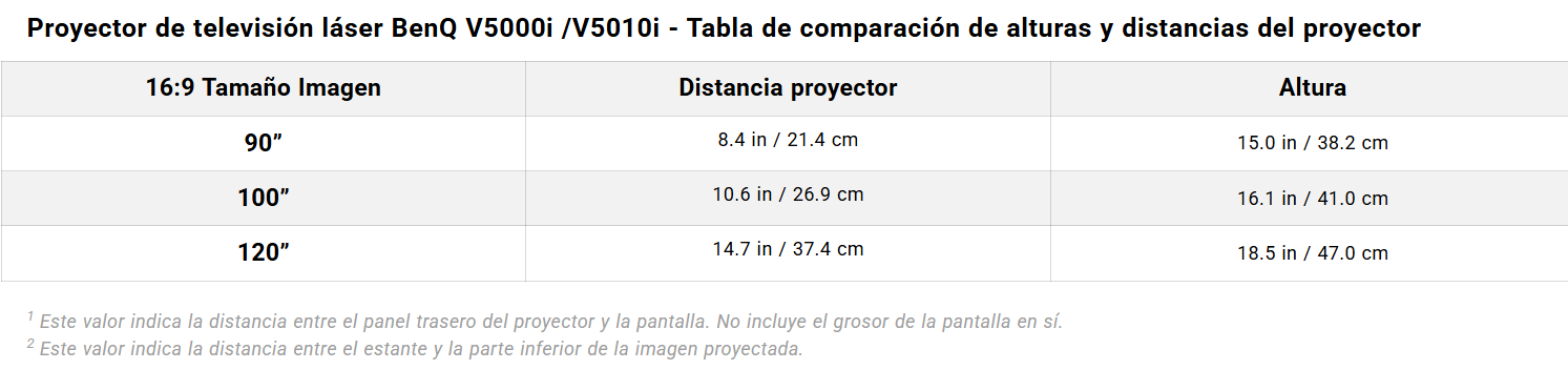 Proyector de televisión láser BenQ V5000i /V5010i - Tabla de comparación de alturas y distancias del proyector