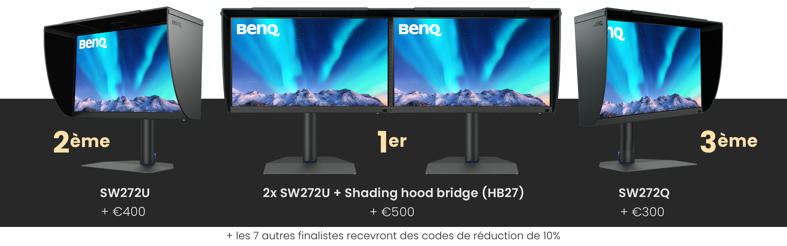 9.  The competition will have one first-prize winner, one second-prize winner, one third-prize winner and 7 runner-ups. The first-prize winner will receive 2x BenQ SW272U PhotoVue monitors, an HB27 Shading Hood Bridge, €500 prize money and a complementary one-year subscription to Pantone Connect Premium. The prizes include delivery costs. The second-prize winner will receive a BenQ SW272U PhotoVue monitor, €400 prize money and a complementary one-year subscription to Pantone Connect Premium. The prizes include delivery costs. The third-prize winner will receive a BenQ SW272Q PhotoVue monitor, €300 prize money and a complementary one-year subscription to Pantone Connect Premium. The prize also includes delivery costs. The 7 runner-ups will receive individual 10% discount codes for the SW and PD monitor lines. Valid for 1 month. The winners will receive their monetary prize in their local currency at the current exchange rate at the time the prize is awarded. The Organiser reserves the right to grant additional “Special Mention” prizes to any candidate at its sole discretion.