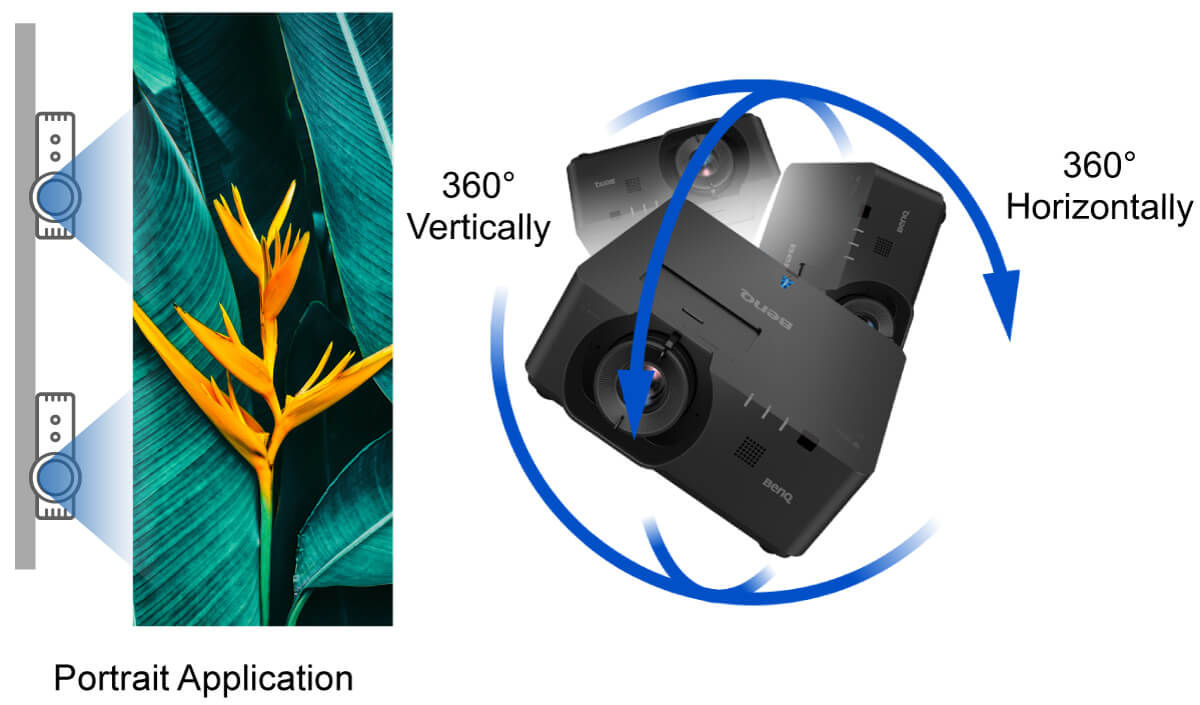 La tecnologia laser garantisce una proiezione affidabile da qualsiasi angolo. Le opzioni di installazione dinamica, come la rotazione a 360° e le applicazioni in verticale, permettono la proiezione su soffitto, pareti, pavimenti o segnaletica angolare.