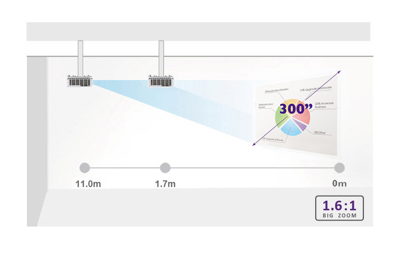 La funzionalità Big Zoom favorisce l’adozione da parte dell’azienda di nuova tecnologia di videoproiezione, sfruttando le staffe per il montaggio a soffitto esistenti e avvalendosi di spazi limitati per proiettare immagini in grande scala. L’SX920 può sostituire i precedenti videoproiettori montati in qualsiasi posizione a una distanza da 1,7 a 11 metri dallo schermo e proiettare immagini fino a 240”, evitando lavori di restauro costosi e tempi di inattività per l’installazione.