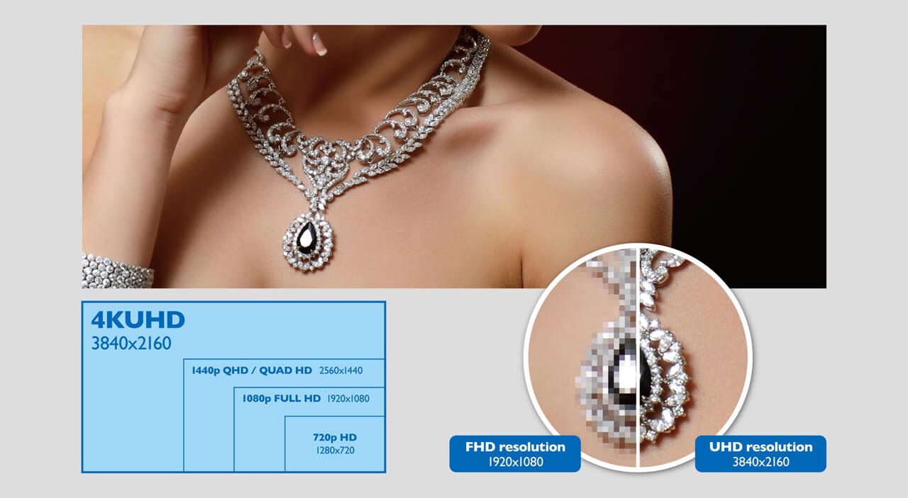 Een vergelijking van QHD, UHD, FHD en HD. 4K UHD biedt superieur detail en authenticiteit ten opzichte van een Full HD-monitor.