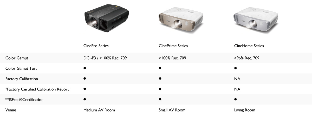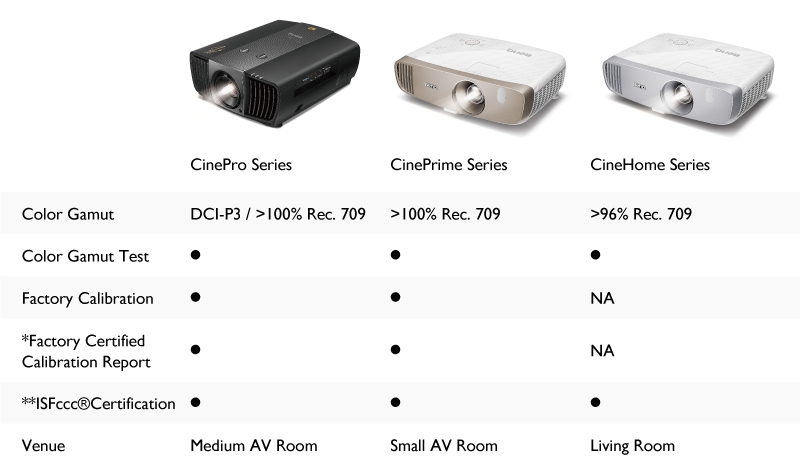 Met behulp van speciale instrumenten en software wordt elke CinematicColor™-projector getest en aangepast voor een nauwkeurige D65-kleurtemperatuur, gamma, zwartniveau, witniveau, neutraal grijs, RGBCMY-kleuraanpassing, tint, verzadiging, helderheid en uitvoer van verschillende interfaces op basis van ITU-R Rec. 709. Door alle gegevens voor afzonderlijke CinematicColor™ fabriekskalibratierapporten te verzamelen, zijn wij het enige merk in de branche dat gebruikmaakt van dergelijke hoge normen van kleurenbereik en gammakalibratie die verder gaan dan Rec. 709-standaarden.