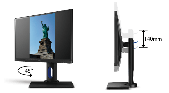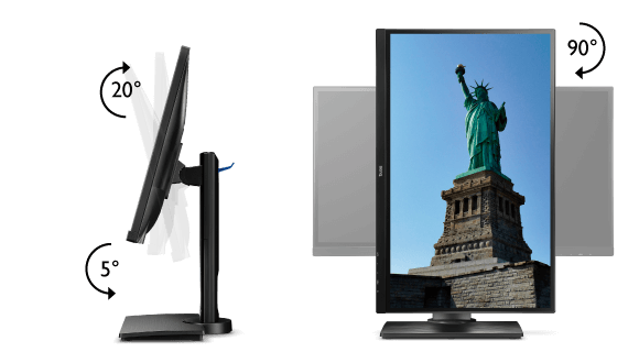 Personaliseer uw werkruimte voor de perfecte gebruikersomgeving met een uitgebreid aantal verschillende instellingen voor hoogte, kantelen, rotatie, slag en ronddraaien van de monitor, zodat u kunt genieten van het bekijken van foto's in hun volledige context.