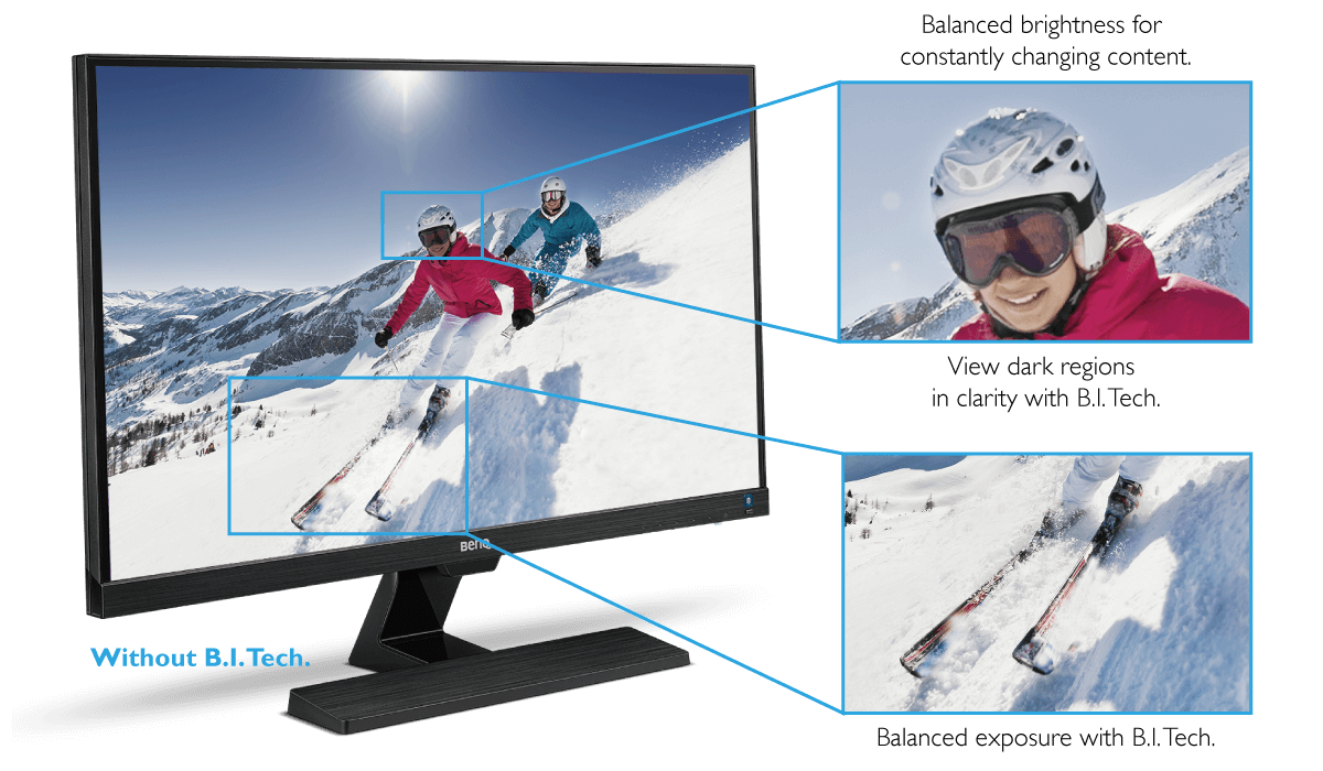 Brightness Intelligence-technologie (B.I. Tech.) detecteert de intensiteit van uw inhoud en past deze aan om ervoor te zorgen dat heldere scènes niet overbelicht raken terwijl donkere gebieden automatisch worden aangepast om een zichtbaar niveau van helderheid te behouden.