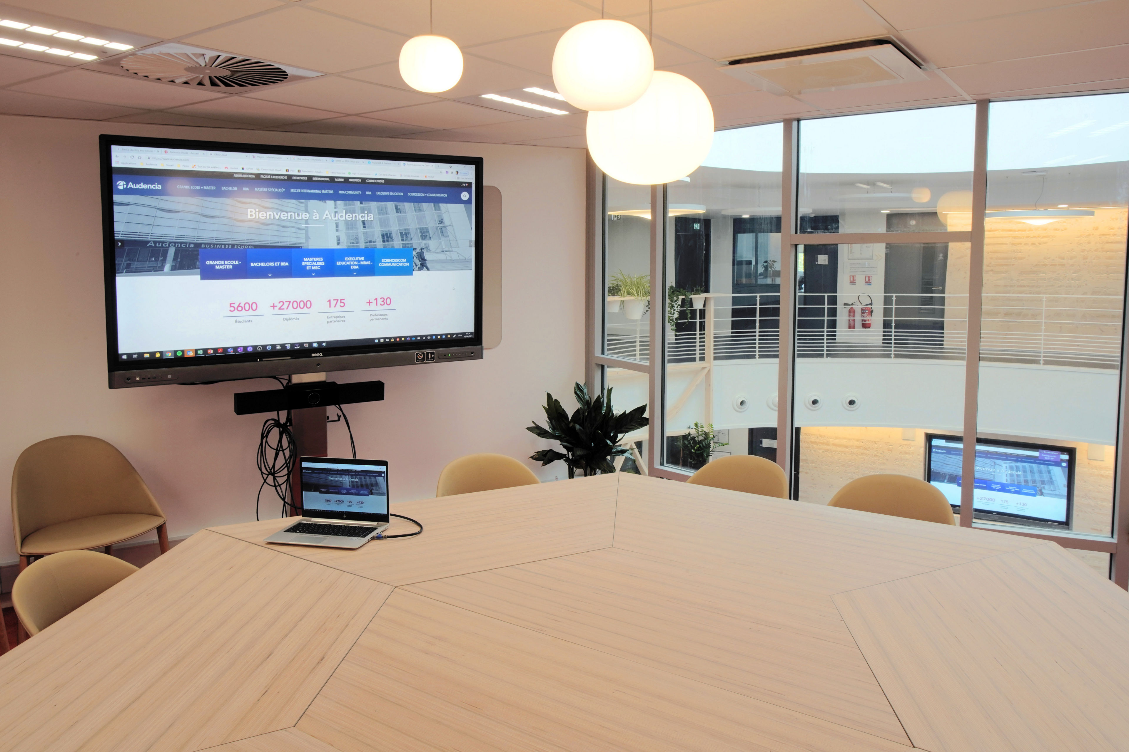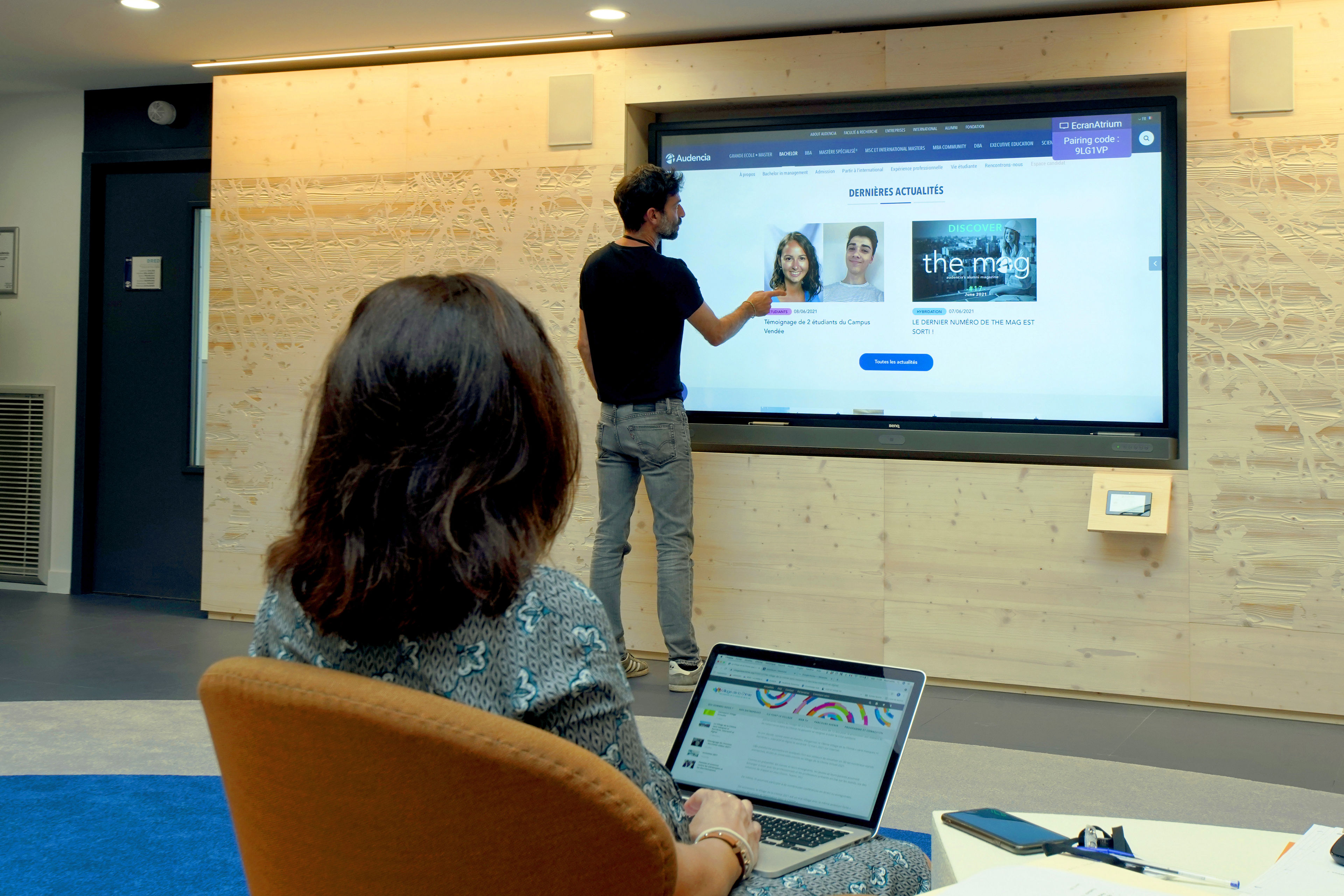 De prestigieuze Audencia Business School in Nantes, Frankrijk, is gespecialiseerd in management en wilde een aantal collegezalen in het gebouw renoveren. De school greep deze kans aan om nieuwe digitale hulpmiddelen te installeren voor zowel professoren als studenten, om zo nieuwe pedagogische scenario's te creëren en de verschillende gebruikers te begeleiden.