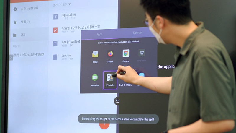"Ik gebruik de split-screen functie vaak," zegt hij. "Ik zet meestal een proefexamen aan de linkerkant en leg dan de oplossingen uit op het EZWrite whiteboard aan de rechterkant." Omdat er twee apps op hetzelfde scherm staan, hoeft hij niet steeds van venster te wisselen. Andere docenten gebruiken de Duo Windows-functie van het bord op dezelfde manier en openen onderwijsmateriaal aan de ene kant van het scherm terwijl ze aan de andere kant whiteboarden of andere apps gebruiken.