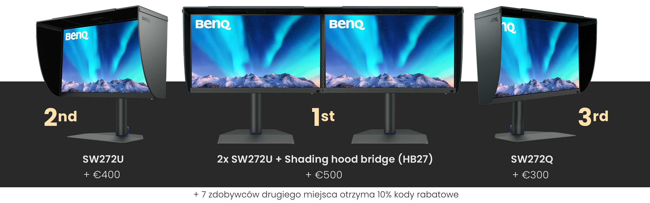 9.  The competition will have one first-prize winner, one second-prize winner, one third-prize winner and 7 runner-ups. The first-prize winner will receive 2x BenQ SW272U PhotoVue monitors, an HB27 Shading Hood Bridge, €500 prize money and a complementary one-year subscription to Pantone Connect Premium. The prizes include delivery costs. The second-prize winner will receive a BenQ SW272U PhotoVue monitor, €400 prize money and a complementary one-year subscription to Pantone Connect Premium. The prizes include delivery costs. The third-prize winner will receive a BenQ SW272Q PhotoVue monitor, €300 prize money and a complementary one-year subscription to Pantone Connect Premium. The prize also includes delivery costs. The 7 runner-ups will receive individual 10% discount codes for the SW and PD monitor lines. Valid for 1 month. The winners will receive their monetary prize in their local currency at the current exchange rate at the time the prize is awarded. The Organiser reserves the right to grant additional “Special Mention” prizes to any candidate at its sole discretion.