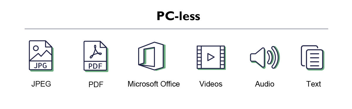 Det räcker emellertid inte för en projektor att bara vara datorfri och ha USB-portar. För att få en riktigt bra datorfri projektionsupplevelse ska projektorn kunna komma åt olika källor, inklusive molnlagring. En projektor som bara har stöd för en lokal eller fysisk lagringsenhet ger begränsningar i ett datorfritt mötesrum.  Internetåtkomst är ett måste.